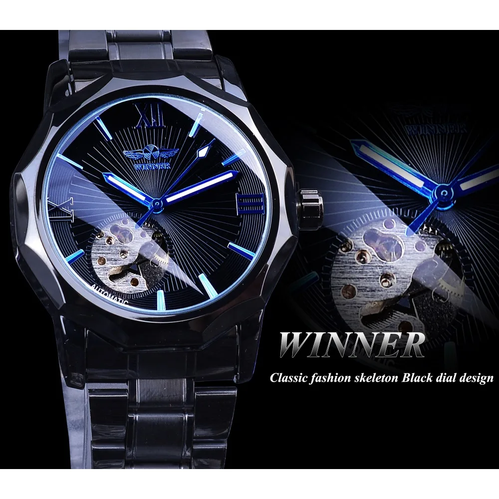 Product Name: Zwycięzca 2019 czarny ze stali nierdzewnej modne niebieskie ręce mężczyzna mechaniczny zegarek Top marka luksusowe nieregularne kształt Dial świetliste dłonie
