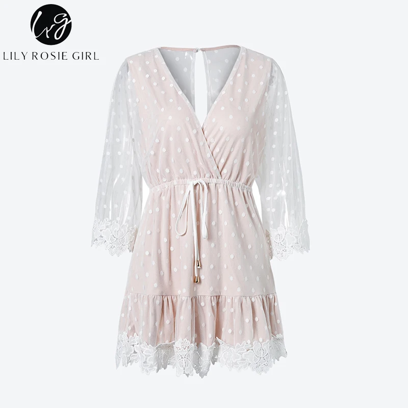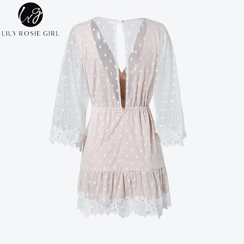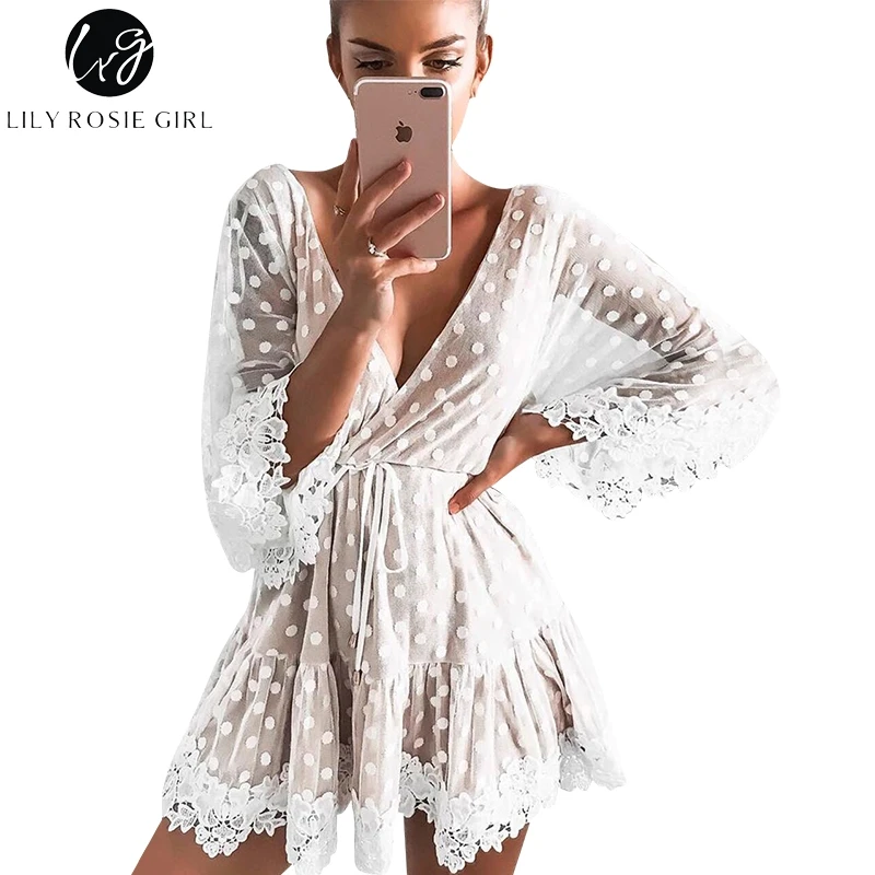 Special Offer Lily Rosie Girl biała koronkowa kropka kobiety Mini sukienki letnia seksowna dekolt V Party Beach strój koronkowy Backless Flare rękaw Vestidos Discount 48% Today!