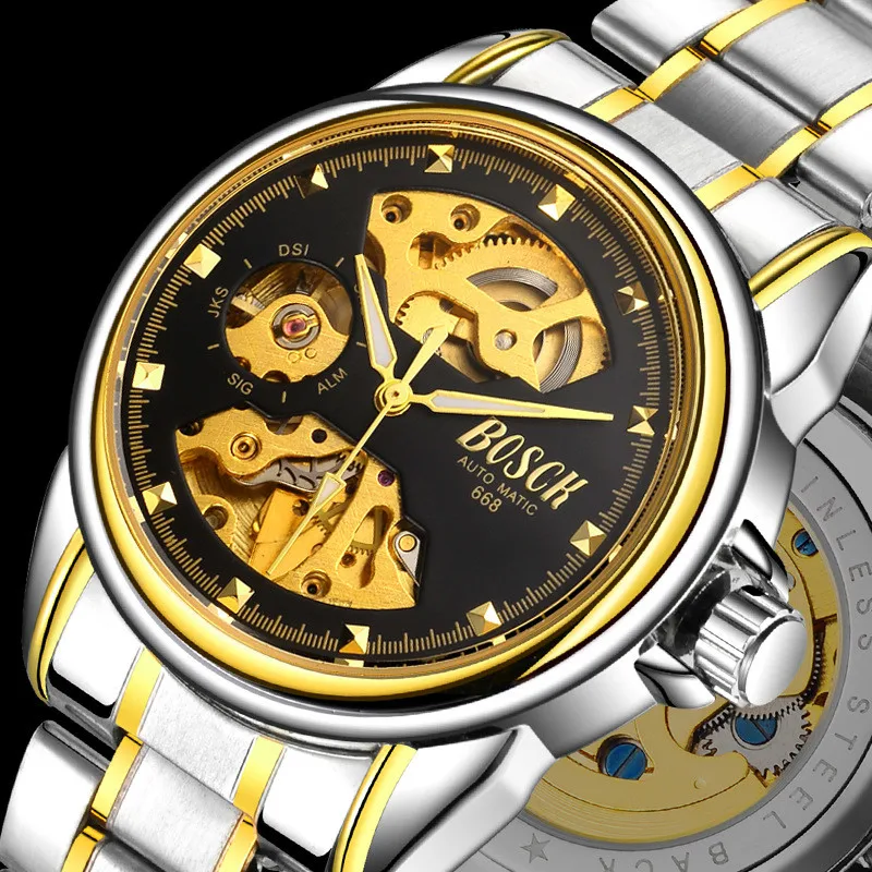 Special Offer Męskie zegarki automatyczny mechaniczny złoty zegarek męski szkieletowa tarcza wodoodporna stal nierdzewna pasek Bosck sport zegarki Self Wind Discount 49% Today!