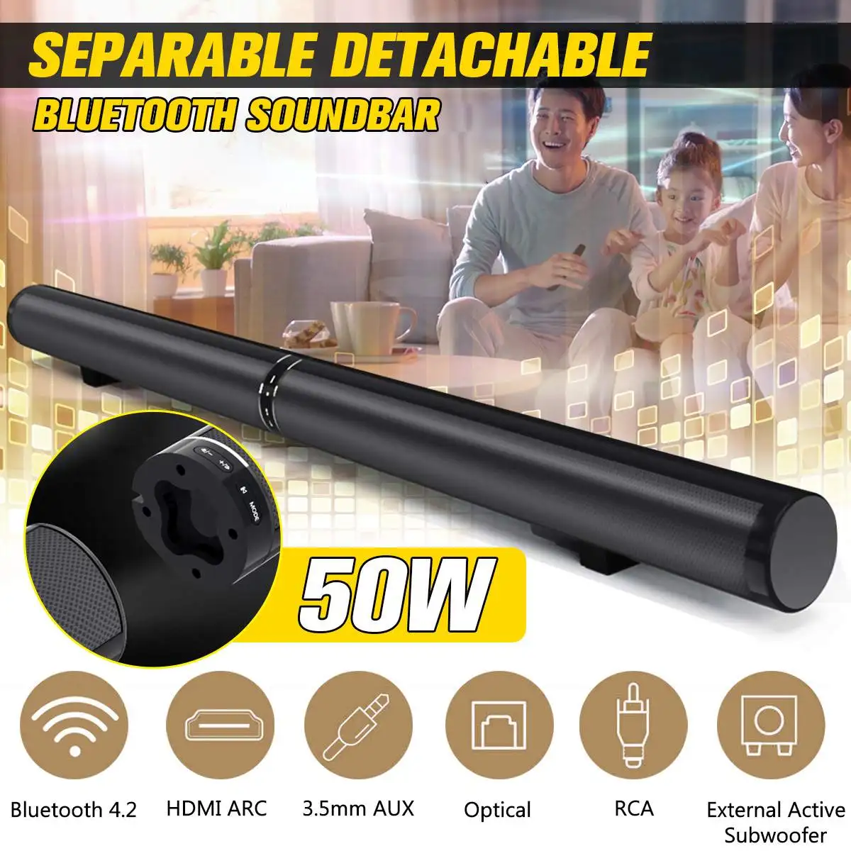 Product Name: 50W odpianane bezprzewodowe bluetooth głośnik soundbar 3D obsługa Stereo RCA AUX HDMI kina domowego komputera PC ściany Bass Subwoofer