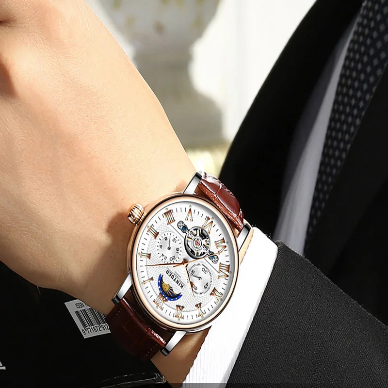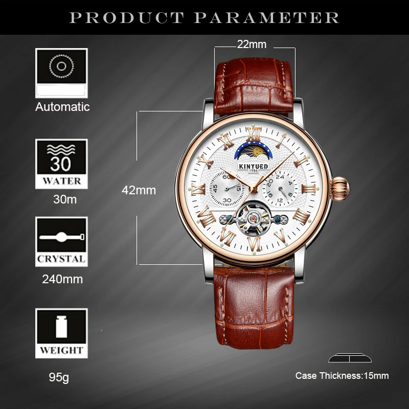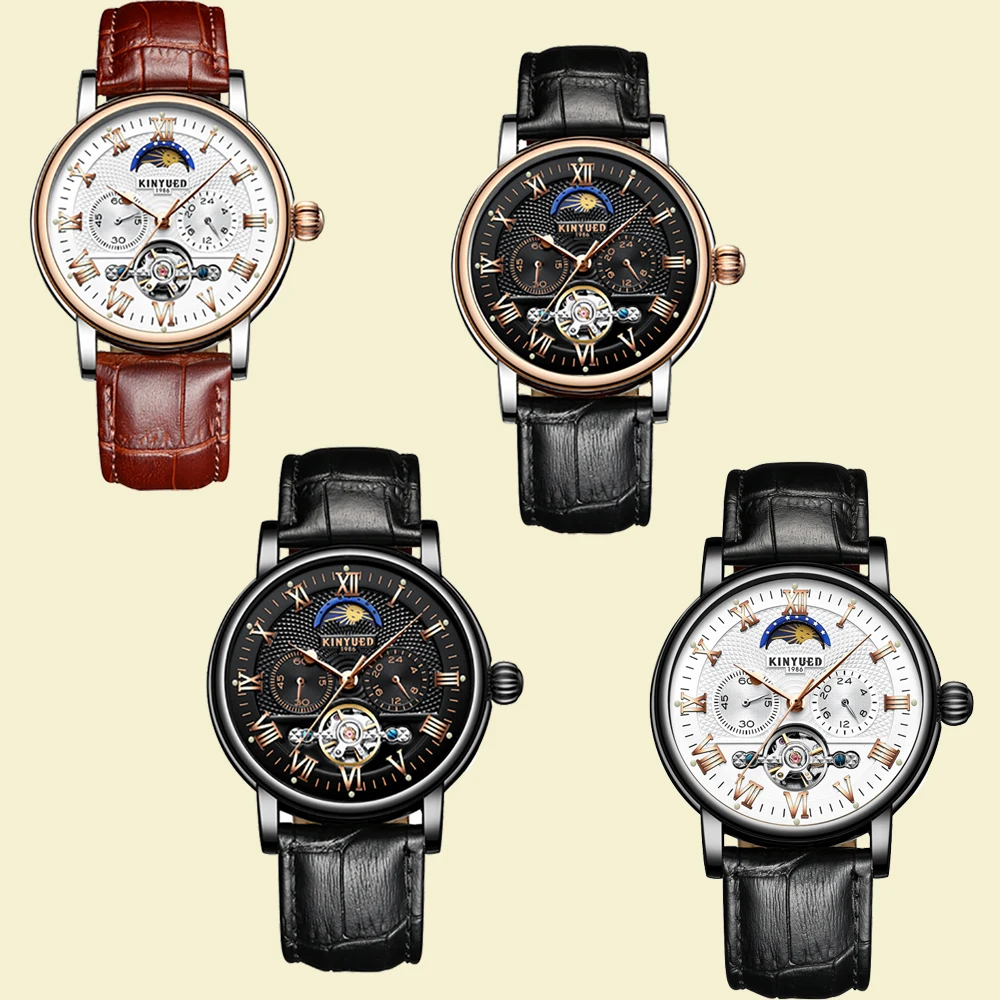 Product Name: KINYUED Chronograph latający tourbillon automatyczny zegarek mężczyźni faza księżyca mechaniczne zegarki szkieletowe montre homme erkek kol saati