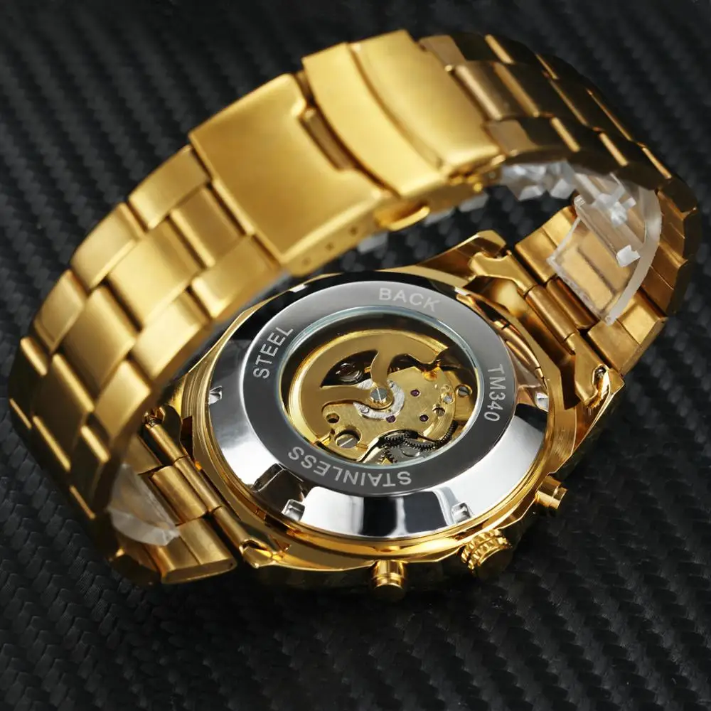 Product Name: Zwycięzca oficjalny złoty automatyczny zegarek mężczyźni stalowy pasek szkielet mechaniczny czaszka zegarki Top marka luksusowe Dropshipping hurtownie