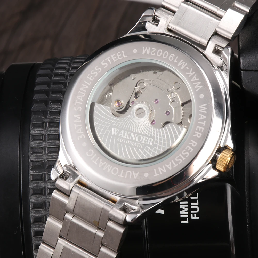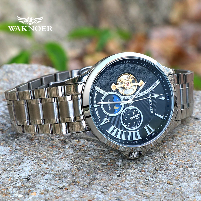 Product Name: WAKNOER automatyczny zegarek mężczyźni luksusowe ze stali nierdzewnej wodoodporna faza księżyca Steampunk mężczyźni zegar mechaniczny Tourbillon Reloj Lujo Hombre