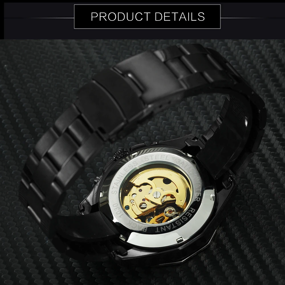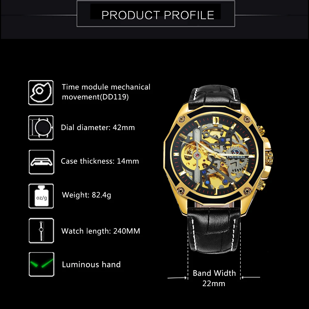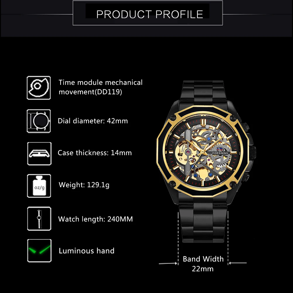 Product Name: FORSINING złoty top marka luksusowy zegarek mechaniczny mężczyźni stalowy pasek szkieletowa tarcza moda biznes zegarki na rękę