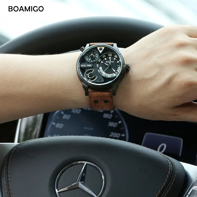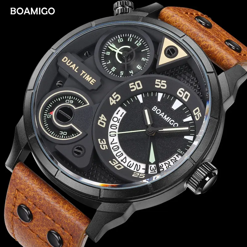 . (Zniżka 80%) Skup Tanie Męskie zegarki moda męska sport zegarek kwarcowy marka boamigo podwójny czas zegarki na rękę z datownikiem skórzany pasek wodoodporny relogio masculino Ceny.