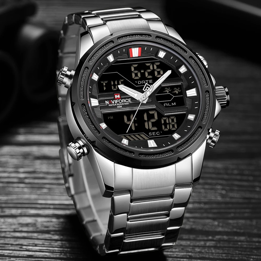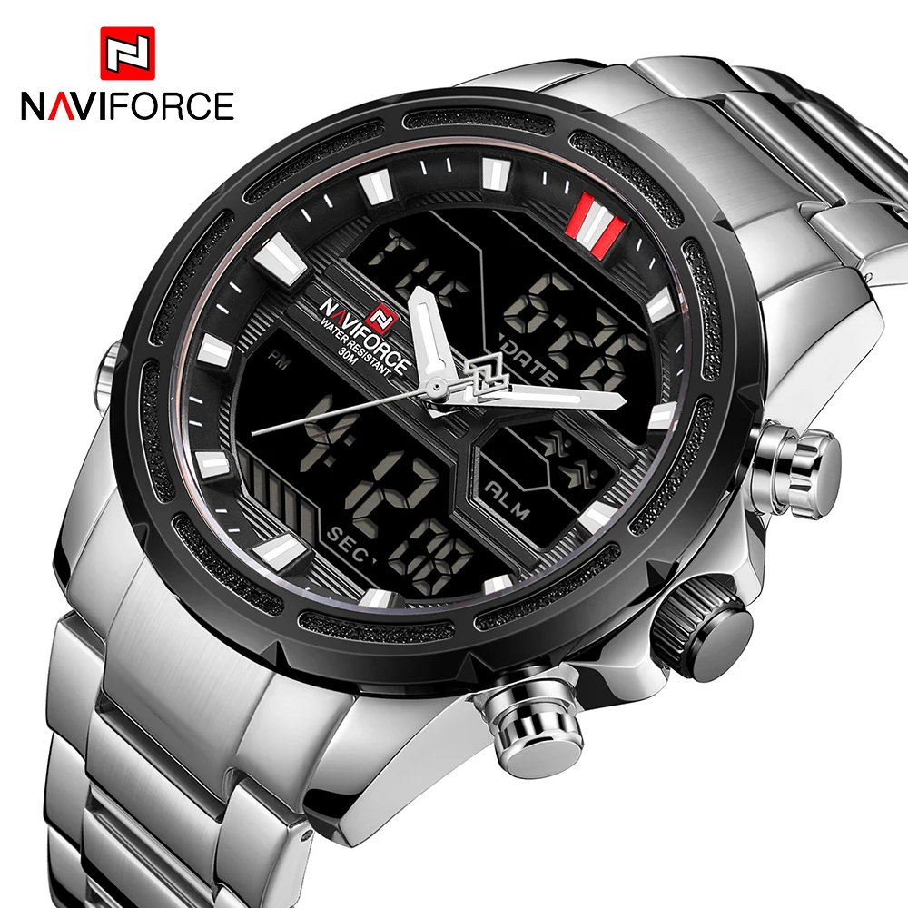 . (Zniżka 92%) Skup Nowe zegarki mężczyźni luksusowa tarcza marka Naviforce LED mężczyźni sport zegarki wodoodporny pełny stalowy zegarek kwarcowy męski Relogio Masculino Najtaniej Ceny.