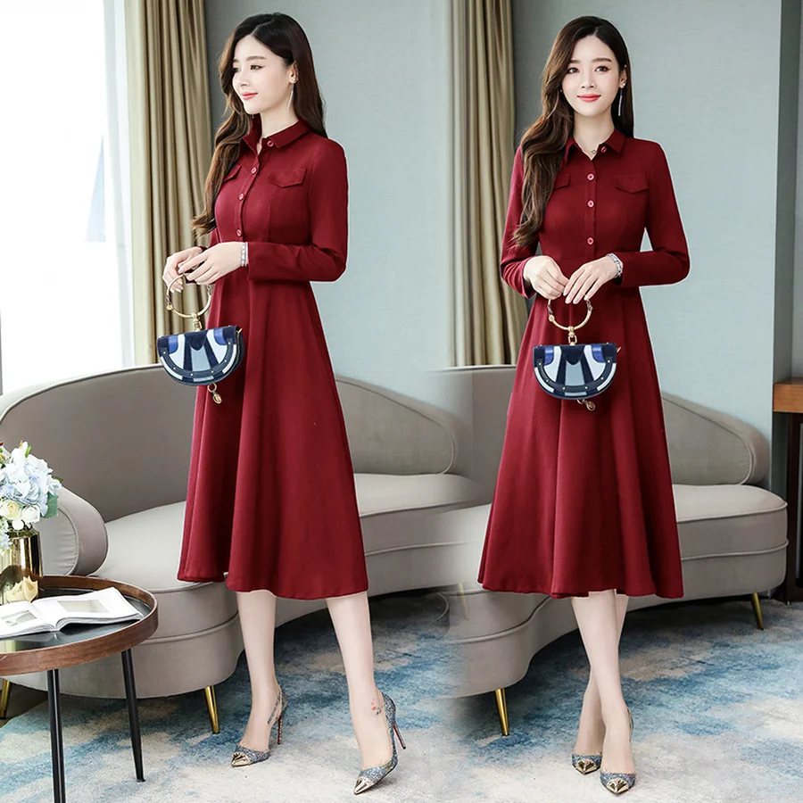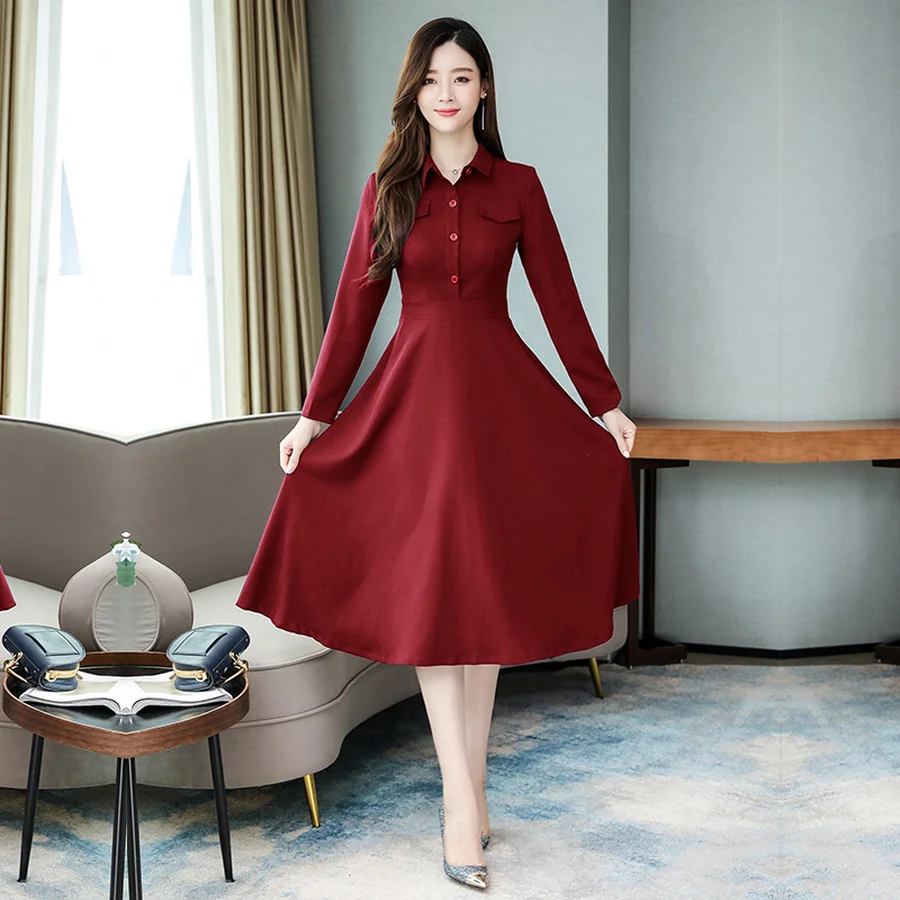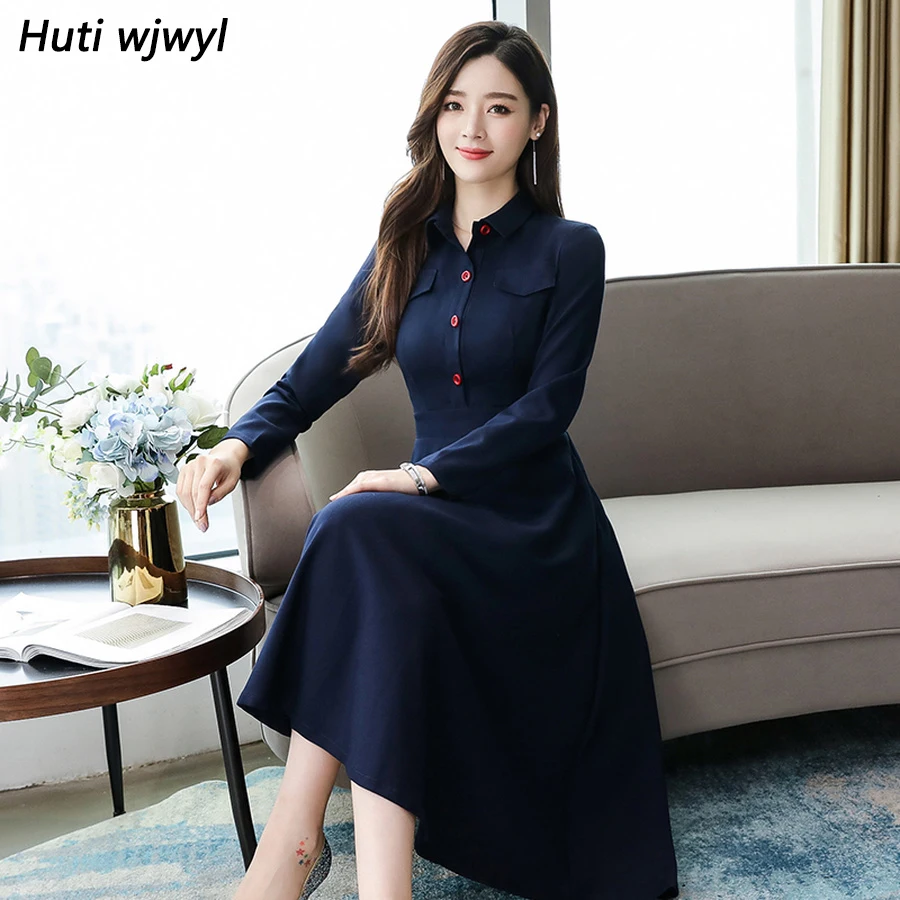 Product Name: 2019 w stylu Vintage wiosna niebieski Chic z długim rękawem sukienki midi jesień zima Plus rozmiar solidna sukienka eleganckie kobiety Bodycon Party Vestidos